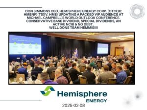 Don Simmons CEO, Hemisphere Energy Corp. (OTCQX: HMENF)(TSXV: HME) updating a packed VIP audience at the World Outlook Conference
