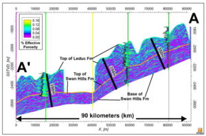 Figure 2: A-A’ Cross-section through Park Place (as shown in Figure 3) of the effective porosity model for Leduc Fm and Swan Hills Fm.