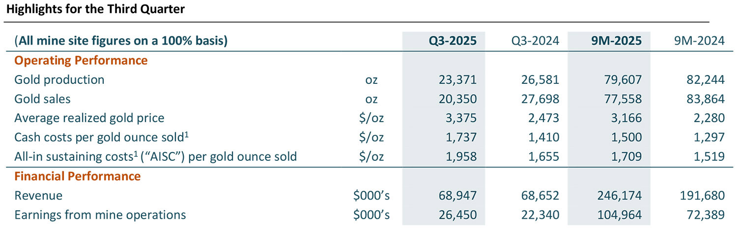 Gold production in Q3-2025 was 23,371 oz, a decrease of 12% from the 26,581 oz produced in Q3-2024.  The lower gold production is attributable to a 14% decline in head grades partially offset by a 2% increase in plant throughput.