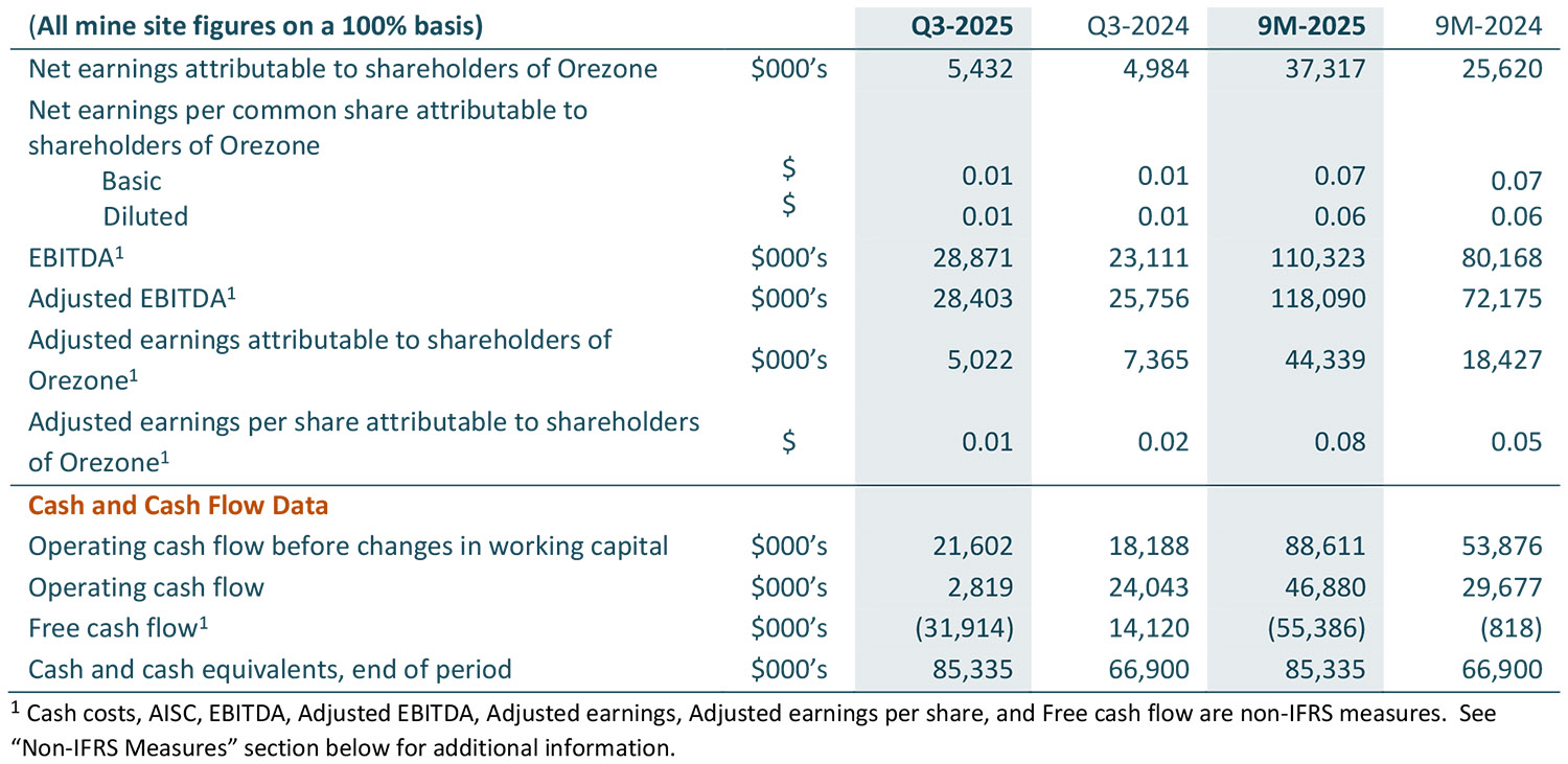 • Robust EBITDA, Net Earnings, and Earnings Per Share:  Reported Q3-2025 EBITDA of $28.9M, net earnings attributable to Orezone shareholders of $5.4M, and net earnings per share attributable to Orezone shareholders of $0.01 per share on a basic and diluted basis as earnings continue to benefit from the record rise in gold prices and unhedged gold sales in the current quarter.  Earnings in Q3-2025 was impacted by delayed sale of gold bullion and from lower-than-planned gold production (see details below).