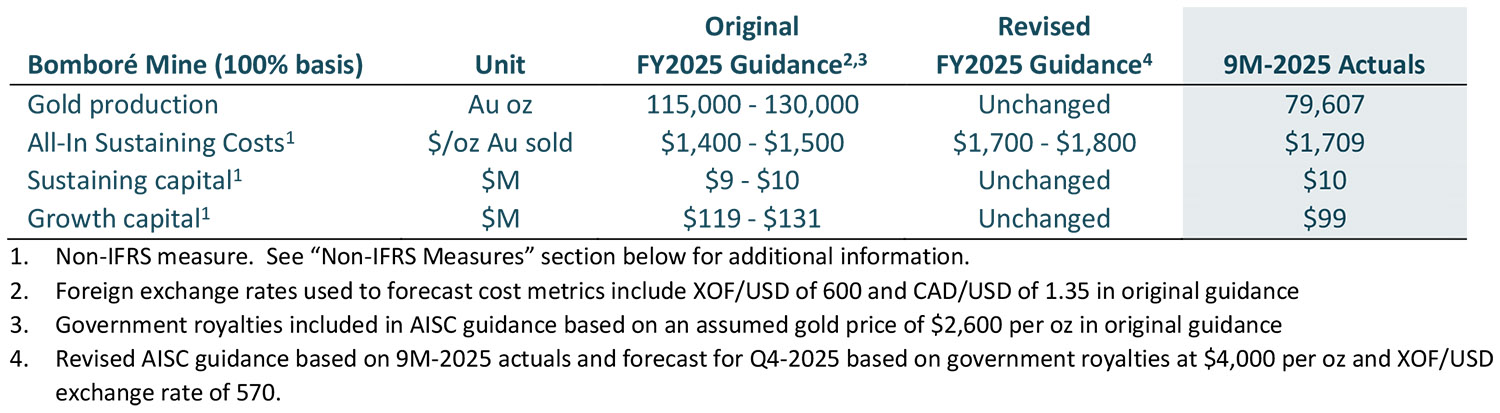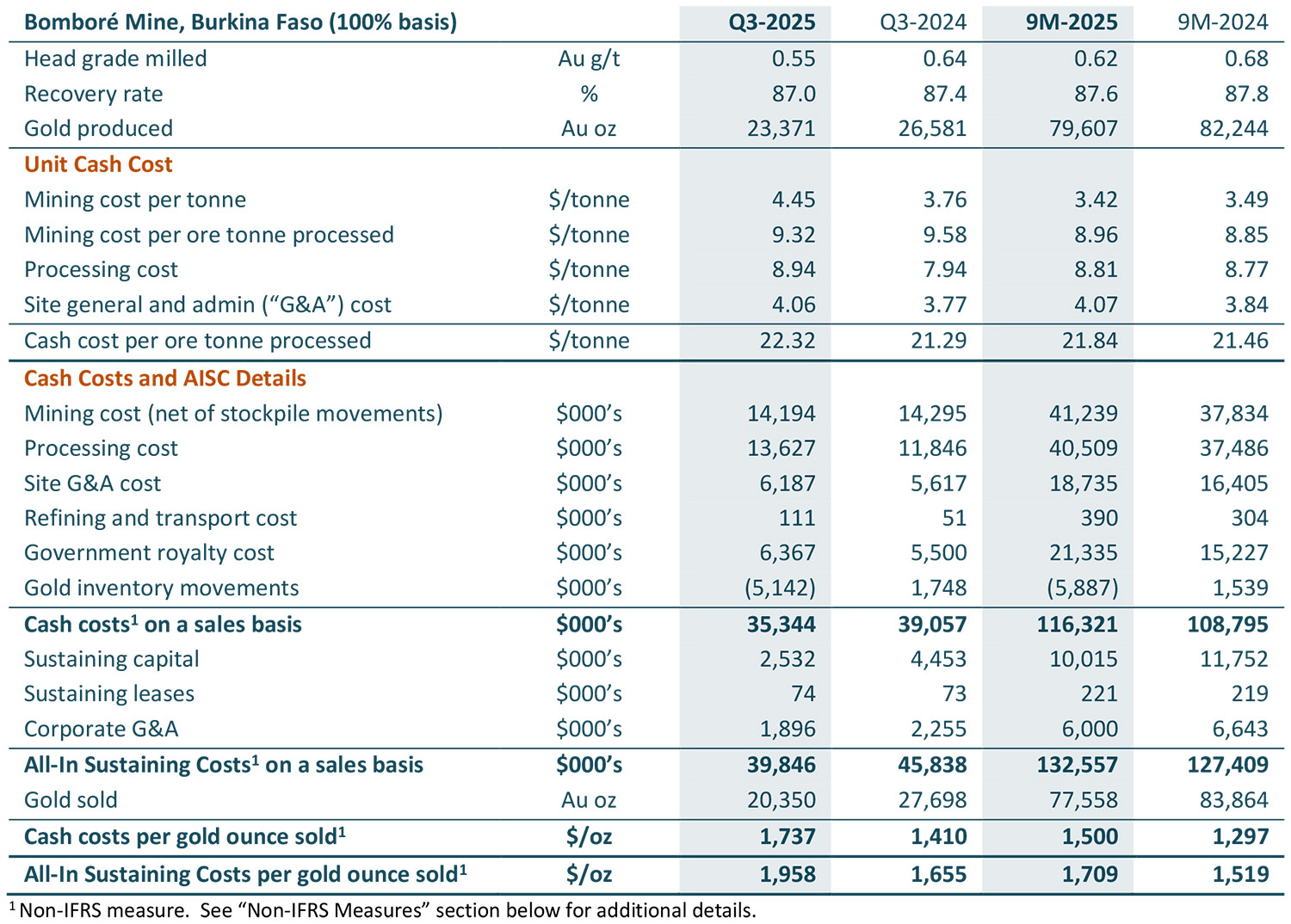 AISC per oz will fluctuate with movements in the gold price and by higher royalty rates introduced in April 2025 by the Burkina Faso government (for each $500/oz increment in gold prices starting at $3,000/oz, royalty rate increases by 1% on the entire gold price).  Costs are also sensitive to movements in foreign exchange rates and to the supply of stable grid power by SONABEL (Burkina Faso’s state-owned electricity company) to the Bomboré mine.  Based on discussions with SONABEL and an external review of the national grid system by a recognised third-party consultant, the Company expected that grid power utilization would remain high in 2025, consistent with availabilities in H2-2024 when utilization exceeded 92% at the Bomboré mine.  Grid utilization improved to 88% in Q3-2025 and 71% for 9M-2025 after a seasonal low of 50% in Q2-2025.