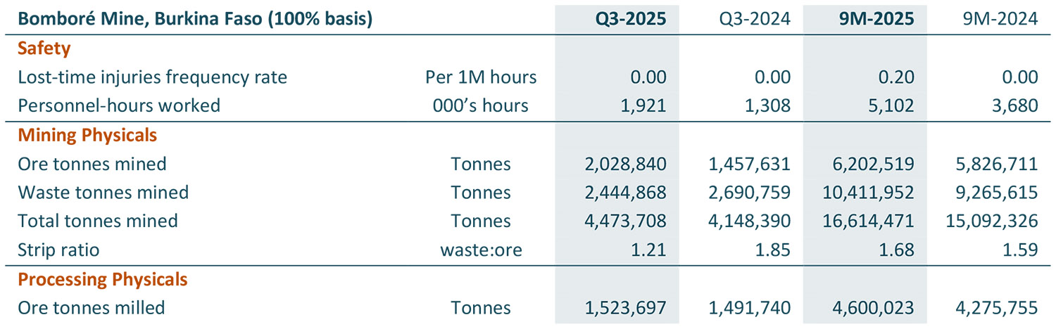 With the Company’s continuing strong focus on cost control, despite continued external cost pressures, cash cost per ore tonne processed in Q3-2025 remained steady at $22.32/tonne, a slight increase of 5% from $21.29/tonne in Q3-2024, driven mainly by a stronger XOF currency impacting costs in all departments.  For mining, higher per tonne mining costs driven by longer haul profiles, and contractor and fuel costs set in the local currency were offset by a lower strip ratio (1.21 in Q3-2025 vs 1.85 in Q3-2024).  For processing, higher per tonne consumption rates for power and lime due to the changing composition of ore fed into the mill and lower grid utilization (88% in Q3-2025 vs 92% in Q3-2024) contributed in part to the 13% increase in processing cost per tonne.