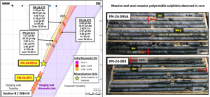 Figure 2: Section view presenting the location of holes PN-24-093 and PN-24-095A, along with core pictures of the intercepted mineralization.